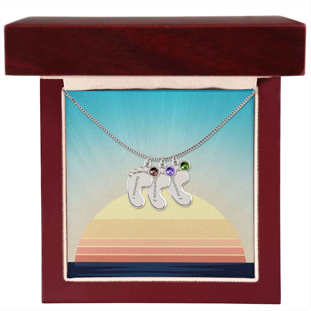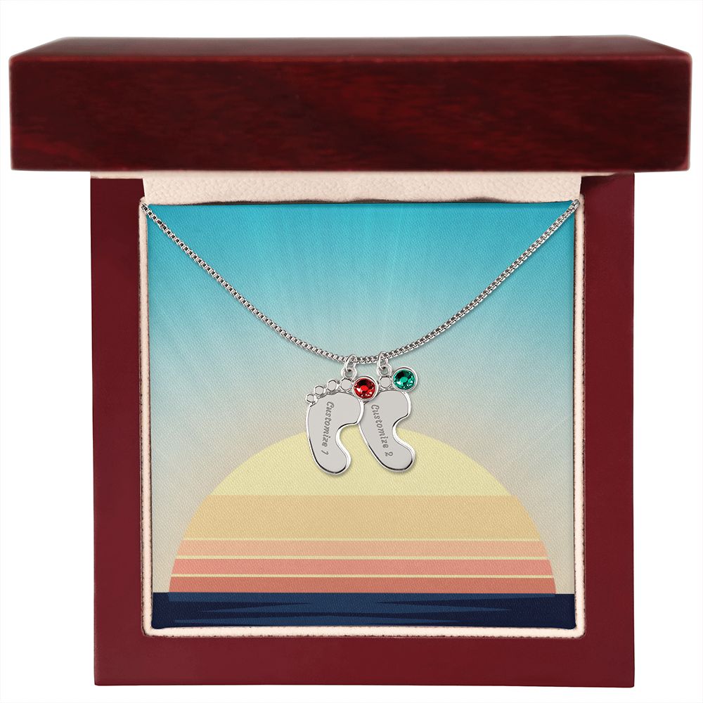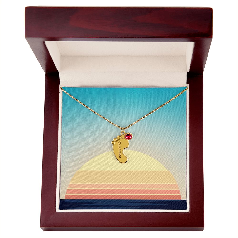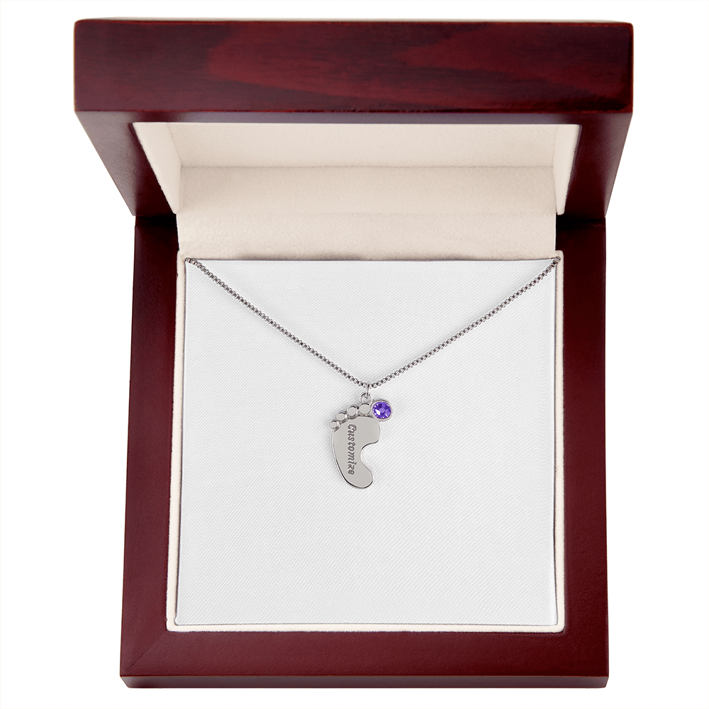 Celebrate the arrival of a newborn or cherish a precious memory with our Custom Baby Feet Necklace with Birthstone. Personalize your gift by engraving a name of your choice onto the pendant and choosing a crystal that correlates with the baby's birth month. And by picking multiple pendants, a custom present like this is perfect for moms and grandmothers with big families. This is a one-of-a-kind keepsake that will be treasured for a lifetime!